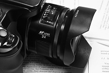 Es handelt sich dabei um die Minolta AF 24mm F2.8 (die ältere Version). Der Fachmann sieht sofort, dass dies eine Festbrennweite ist (d.h. man kann nicht „zoomen“ sondern muss den Bildausschnitt mit den Füßen verändern ;-)). Die Maximale Blende von 2.8 ist auch nicht schlecht (dadurch ist die Linse relativ lichtstark, und man kann recht schöne Tiefenunschärfe erzielen).